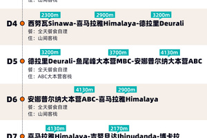 【行程概述】今天全程很多上上下下路段,还有很多台阶,所以要带好护膝,路过不少补给点有美味的咖啡奶茶,还有当地的特色美食,到了鱼尾峰大本营MBC也是会看到很漂亮的景色的观景平台之一。徒步时间约为6-7小时,途经鱼尾峰大本营MBC(3700m),到达ABC大本营(4130m),这段路上我们会看到安娜普尔纳Ⅰ峰(8091m)、安娜普尔纳南峰(7200m)、鱼尾峰(6993m)、安娜普尔纳III峰(7500m)、辛楚力峰(6440m)等。