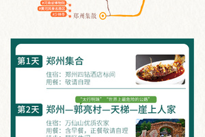 全国各地的小伙伴们到达郑州集合。到的早的亲们可以到【河南省博物院】去看看人类文明的起源发展,也可以到【黄河风景名胜区】去,感受母亲河的大河文化,还可以到【少林寺】去,学习一招半式的少林功夫……一定记要品尝河南特色美食哦,河南烩面、道口烧鸡、胡辣汤……