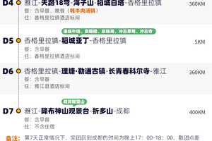 4、景交:四姑娘山观光车70元/人(必须),甲居藏寨观光车35元/人(必须),墨石公园观光车20元/人(必须),稻城亚丁观光车120元/人(必须)、稻城亚丁游览车70元/往返(可选);