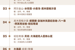 4、不可抗力:如果因为人力不可抗拒因素(如塌方、泥石流、路桥被毁、航班延误、国家政策、战争、瘟疫、交通管制、堵车等)导致不能履行合同和旅程变化,“大美山野·罗布泊”不承担相关赔偿。