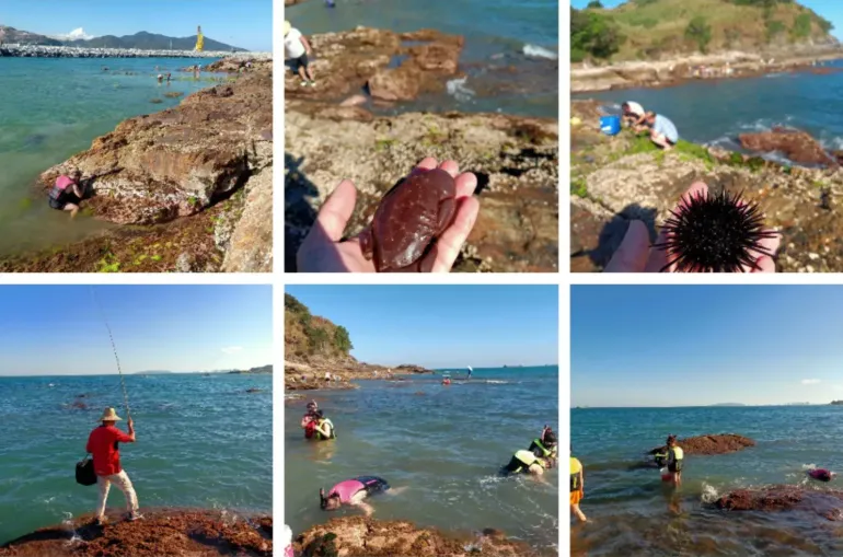 13:00 徒步黑排角精华海岸线,这里可谓是风光摄影爱好者的天堂,怪石嶙峋,痕迹犹如刀刻斧凿一般,色彩多变,白浪翻滚,如果带上滤镜,可以拍摄出非常梦幻的场景。一路上都有不少海货,免费提供赶海工具,让大家体验赶海的乐趣。
