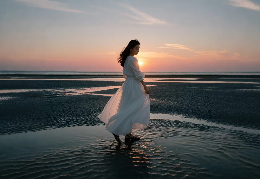 此时若穿上裙子,只要纯色就行赤脚踩在滩涂上不管怎么拍,你都是坠入凡间的仙子