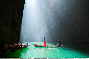 沿着景区步道下到峡谷河边,欣赏沿途的风景,角度不同,欣赏到的风景也不尽相同。峡谷深达百余丈,溪水碧蓝清澈见底。如遇晴天,阳光折射入水面,行舟于上宛如悬浮在空中一般;如遇雨天,峡谷之中因为温差情况, 会行程一层层薄薄的雾气,烟雾缭绕,如遇仙境。