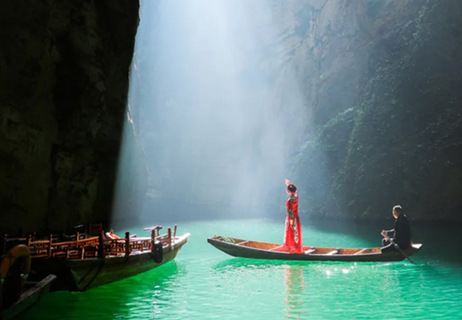 沿着景区步道下到峡谷河边,欣赏沿途的风景,角度不同,欣赏到的风景也不尽相同。峡谷深达百余丈,溪水碧蓝清澈见底。如遇晴天,阳光折射入水面,行舟于上宛如悬浮在空中一般;如遇雨天,峡谷之中因为温差情况, 会行程一层层薄薄的雾气,烟雾缭绕,如遇仙境。