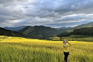 层层金黄的稻穗,仿佛镶嵌在大雾山脚的一片黄金