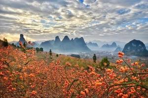 10:30到达 “中国最美瑶乡”美誉的恭城瑶族自治县,魅力恭城的中国月柿之乡——【恭城红岩新村】,一路可以欣赏到红红火火的柿子像灯笼一样挂满枝头,点缀漫山遍野,宛如红色的海洋,构成了一幅幅美丽的山水画!(注:如果红岩村没有柿子了,改去恭城其他园区柿子园)