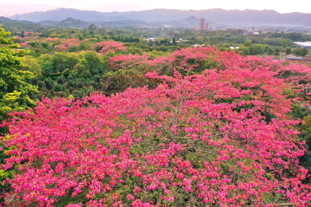 还种植了紫花风铃,以及3万株茶花艳压枝头,醉蝶花铺就七彩花毯,美丽异木棉如云似霞,色彩顺着花田绵延至远山,将“阳光裹着花香”的诗意场景具象呈现。