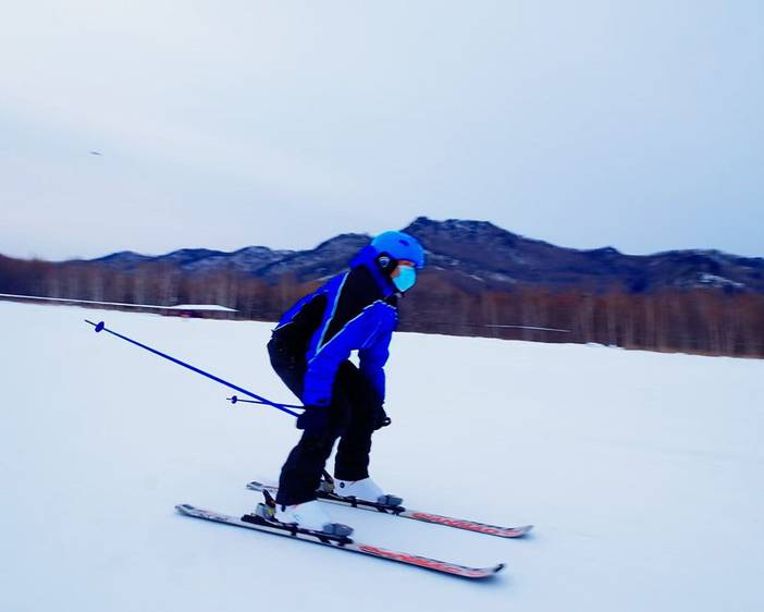 2、滑雪基本姿势:双膝微曲。眼自然平视远方而不要盯着自己的雪板尖看。重心向前而不要向后,小腿要向前用力压紧雪靴。双手握雪杖向前举起,双肘微曲。初学者不要把手套在杖柄的绳套内。