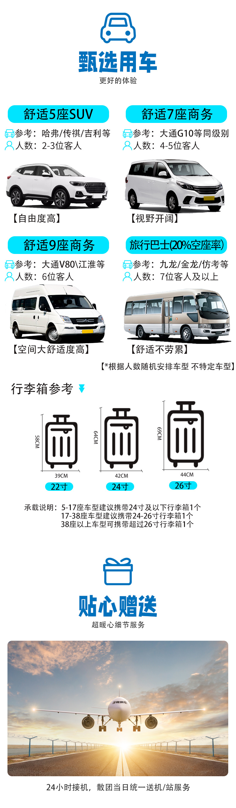 9、24小时接机服务,1人也可接,前后航班相差半小时需等待,提前2天预定,否则视为自动放弃。