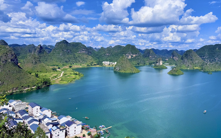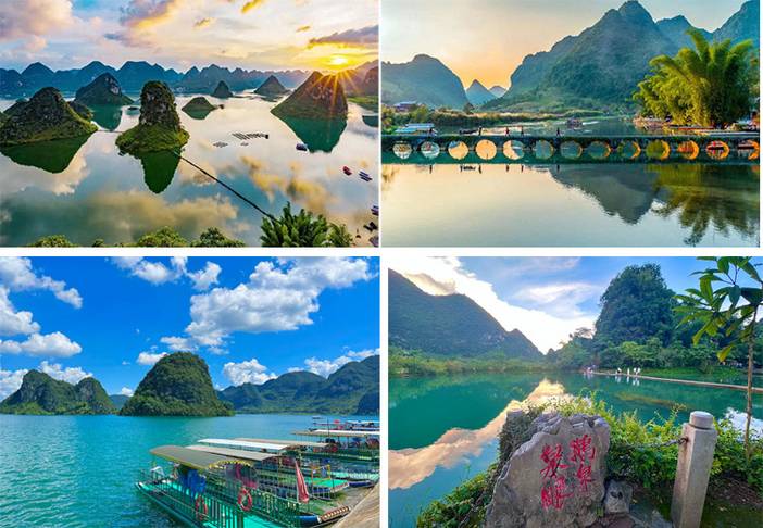 它被誉为"水上桂林"、"大里的海洋”。湖中有十多个大小岛屿,四周环绕着喀斯特峰林,沿岸点缀着几百个壮族干栏式村寨,湖面平静如镜,景色如画。
