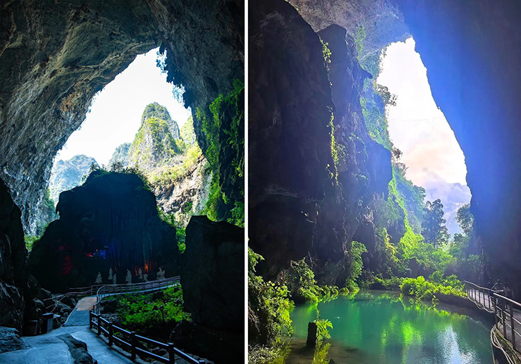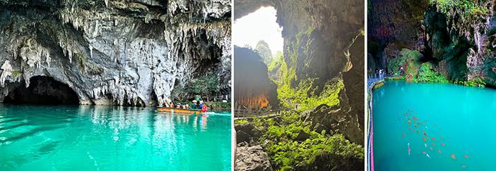先到水波天窗【百鸟岩】,3.5小时车程。乘船深入地下暗河,探寻溶洞深处的秘密,感受“三天三夜”。抬手便可触及那些亿万年前的钟乳石。