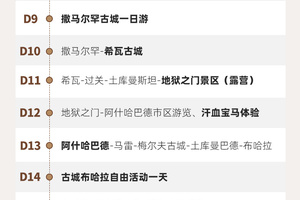 【行程概述】布哈拉有着丝绸之路活化石之称,是阿凡提的故乡,布哈拉作为乌兹别克斯坦的第三大城市,有着2500多年的历史,它保存了许多中世纪时期优秀的建筑,因此我们特意在布哈拉安排了一天自由活动时间,大家可以根据自己喜好前往卡杨宣理塔、布哈拉老城、圆顶集市、打卡孤独星球同款的四塔清真寺,前往布哈拉夏宫和冬宫,无论从景观造型,或是内部陈设和装饰都保留着古风古貌,是中亚地区最完美无缺的中世纪城市典范。如果参观了以上这些景点还不觉得疲惫得话,可继续参观,特色的古城区,有趣的鹅池,还有独特的手工地毯厂都会让我们的行程变得丰富有趣。