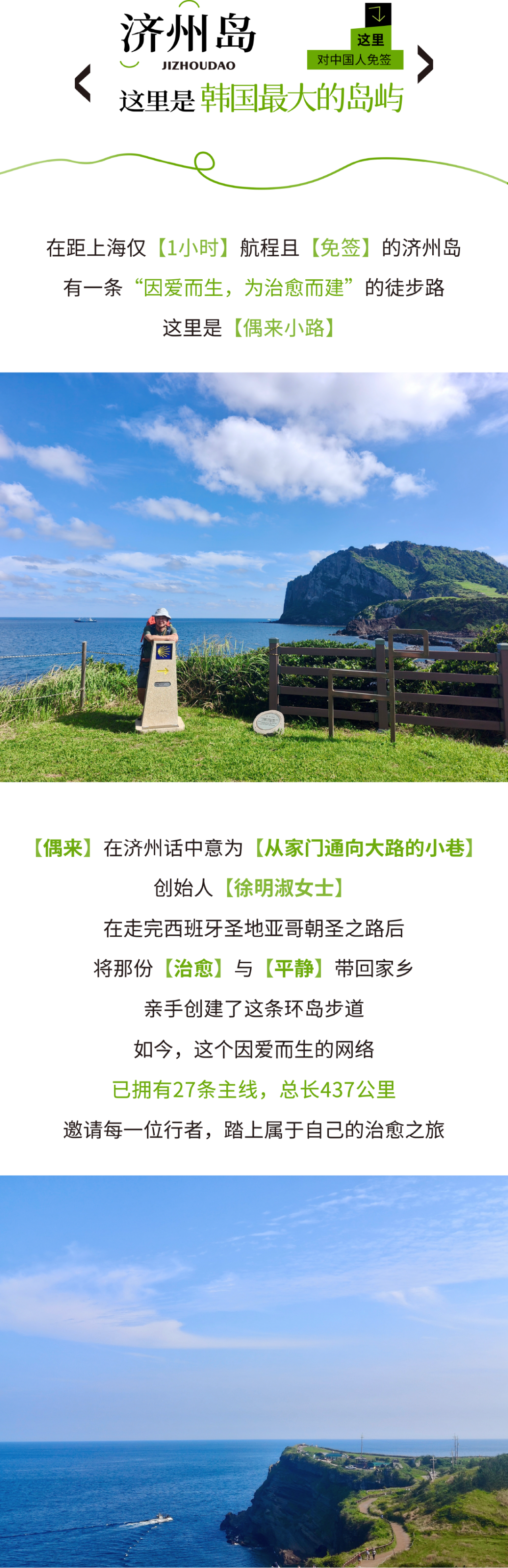 早餐后坐车前往1号线起点,这也是济州偶来最先开始的路线。,真正意义上的起点。经过绿油油的田野,登上末尾岳、卵岳,,看到城山日出峰、牛岛、一眼望去犹如展开画布的的原野和大海。 黑色石墙围绕的田地星罗棋布地连在一起的田野,就像用五连六色的布缝好拼贴上的一张方格布一样的美丽。