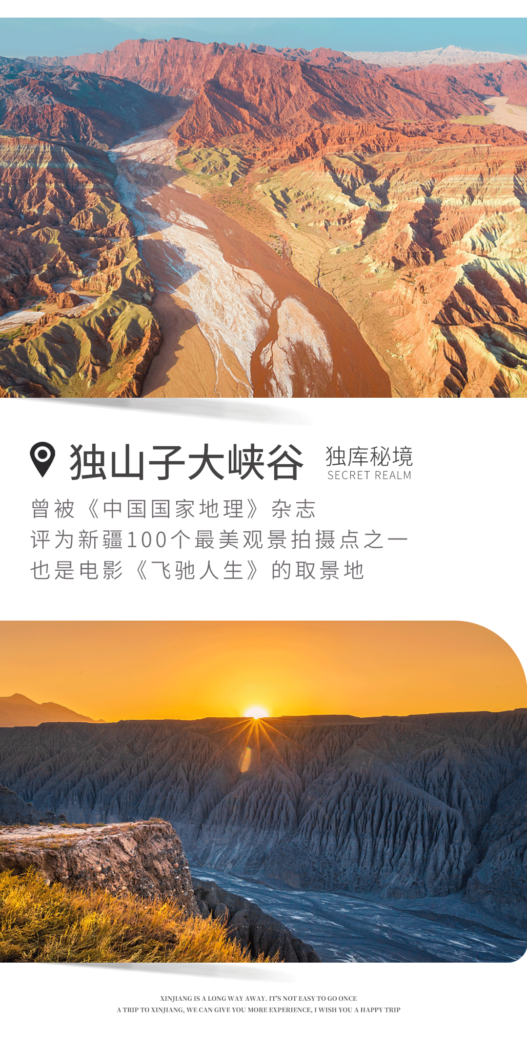 早上用完早餐后,前往独山子大峡谷,拥有“独库秘境,亿年奇观”之称的独山子大峡谷位于独山子区境内,水冲出天山后,切割独山子西南方向倾斜平原形成的神奇风光峡谷,峡谷两岸的阶地很是壮观,天山雪水及雨水流下来经过这里的土壤形成的冲积沟壑,在谷壁雕凿出这些奇特景观。