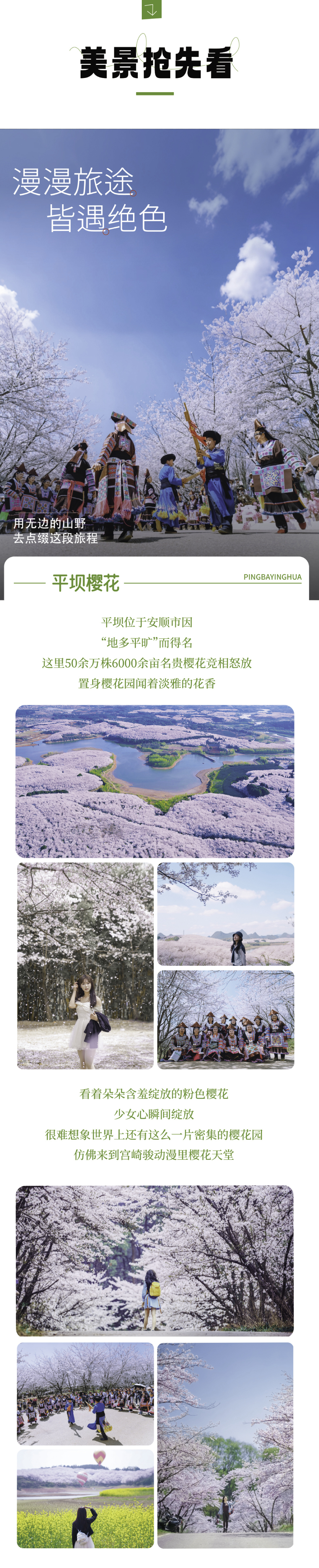 早餐后乘车出发世界级赏樱地——平坝樱花。我们选择一条与普通游客大部队不一样的路线进入樱花园,避开客流高峰,徒步游览边走边拍,各种“神仙角度”凹造型拍美照。