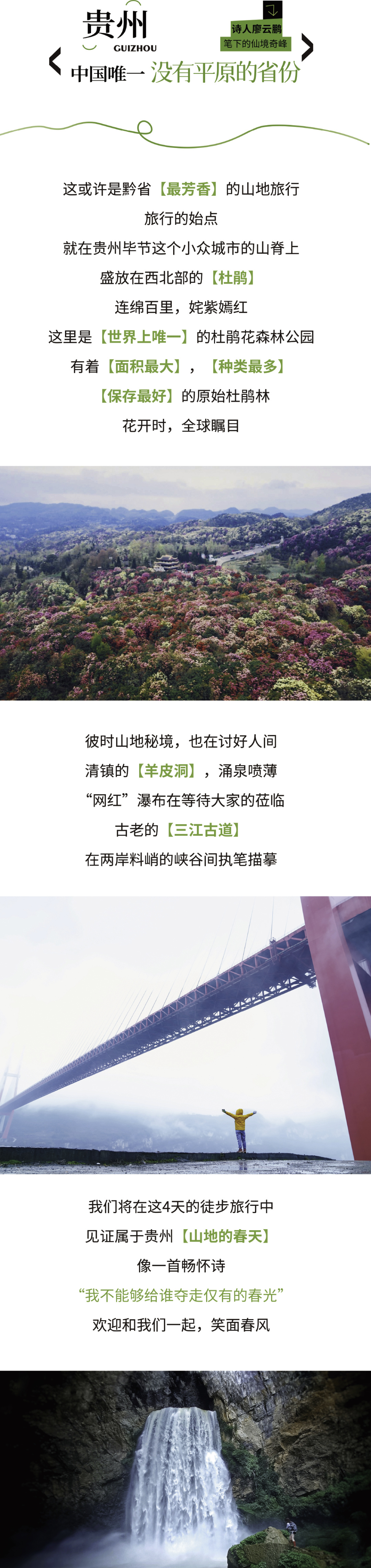 1)衣裤:贵州的3-4月份温度12-26度左右,建议带冲锋衣\软壳冲锋衣裤\保暖速干衣裤。(樱花园内的行程可穿裙子或其他适合拍照的衣服)