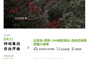早餐后乘车前往黔西三江密道徒步起点,整理装备,简单热身后开启今日的徒步旅程,沿乡道,山路、绿道徒步。(中午适时分享各自带来的美食午餐)。