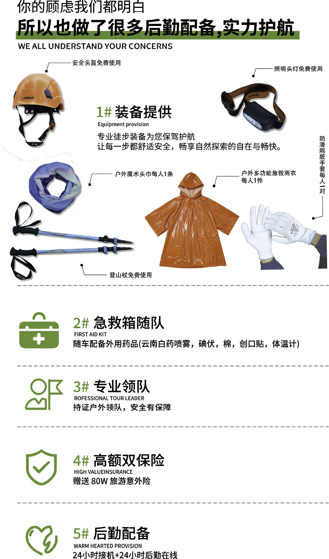 3.活动提供装备中说明的:头盔/头灯/登山杖/免费租借(用后回收),赠送头巾/手套(不回收)