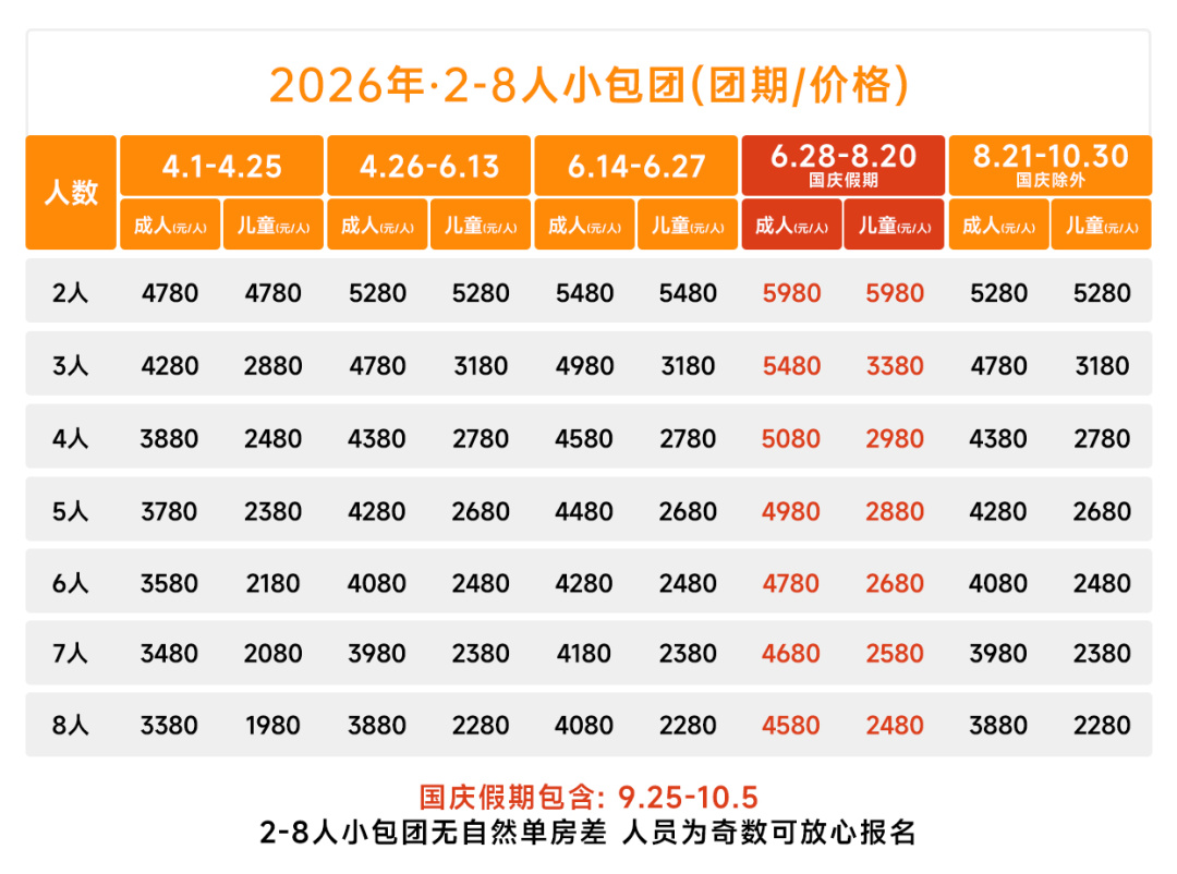 以上团期:成人3880元/人,儿童2280元/人, 房差:800元