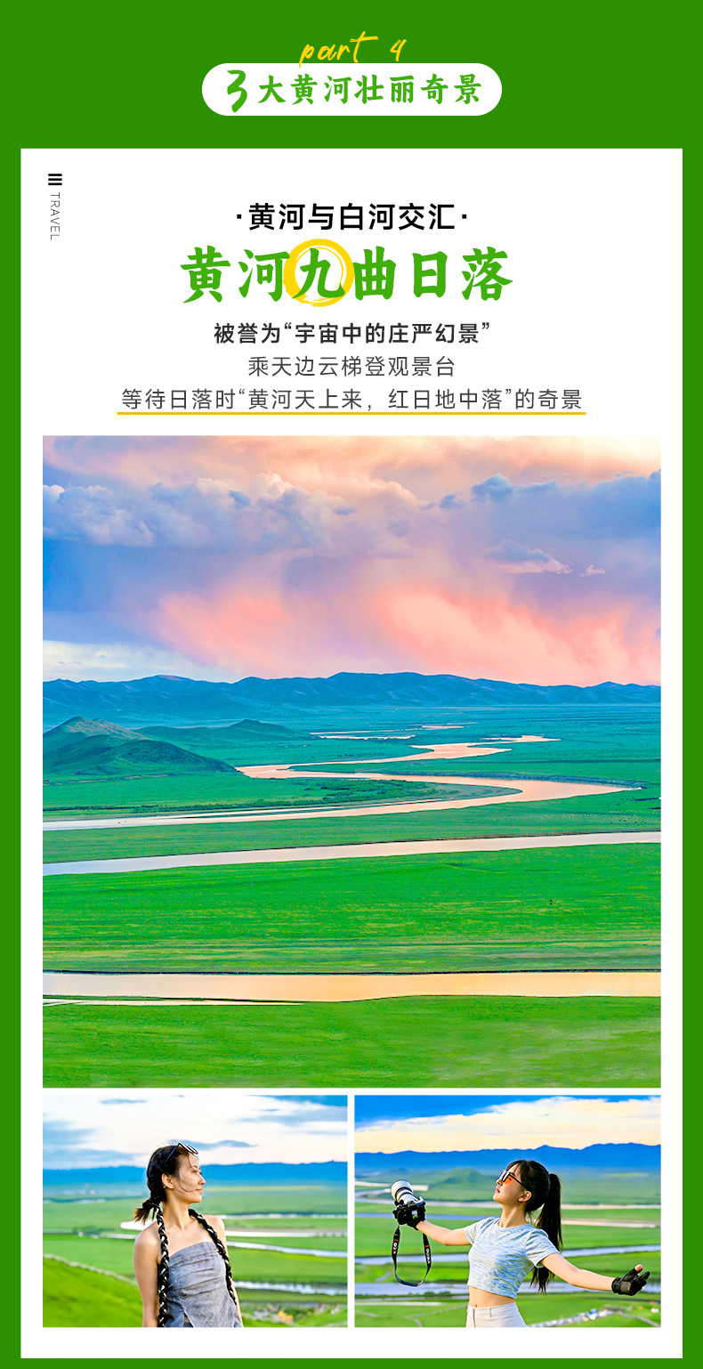 下午,前往【九曲黄河第一湾】(车程约100KM,车程约1.5小时,游玩约2小时),这里是黄河唯一流经四川的段落,形成"S型"绝美弯道。乘扶梯上山顶,看夕阳将九道弯染成金色,被誉为"宇宙中ZUI浪漫的曲线"。在黄河栈道:近距离拍摄水流与草原,也可以前往红教寺庙,可俯瞰黄河全景!