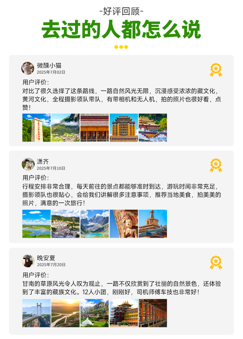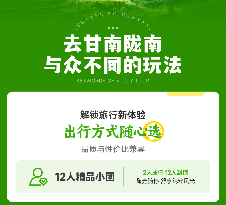 3、行程结束当天18:00左右抵达兰州西站,大家可以依据自己的时间,自行选择继续游玩或是启程回家。火车建议购买19:30以后的车次,高铁建议购买19:00以后的车次,飞机建议购买21:00以后的航班。兰州西站距离兰州中川机场约68公里,车程约1.3小时。大家根据自己的航班车次选择返程票。