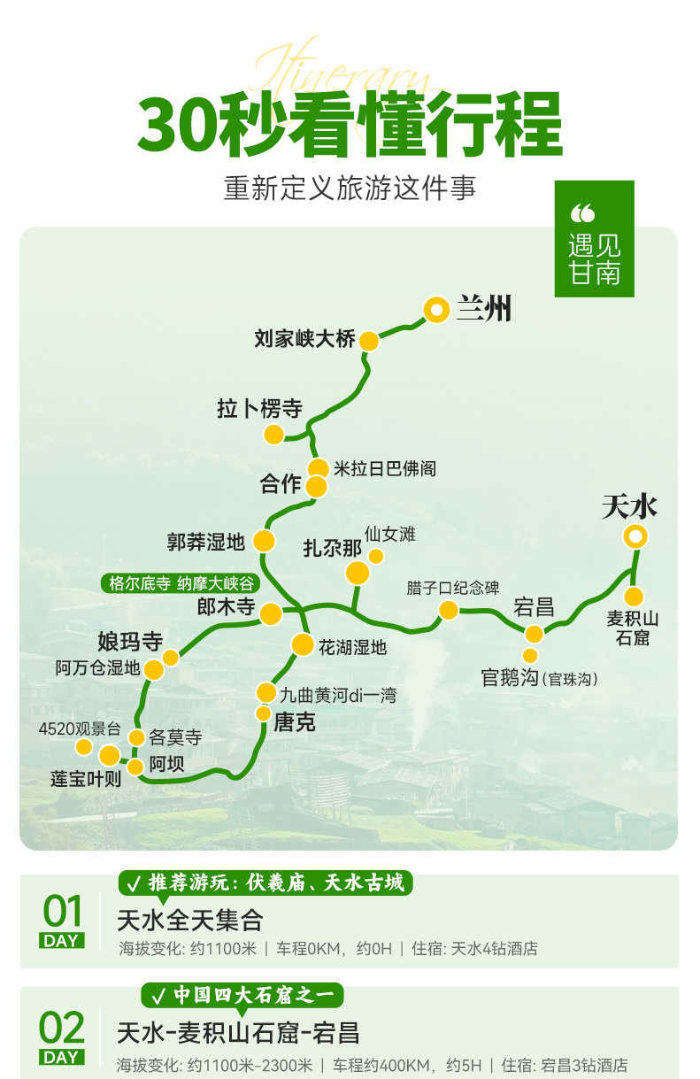 今天为全天集合日,我们相聚在天水,出发前1-3天短信通知集合酒店及领队联系方式,领队会在出发前一天下午18:00前联系您。到达酒店向前台报【甘南+姓名】及有效证件入住酒店。
