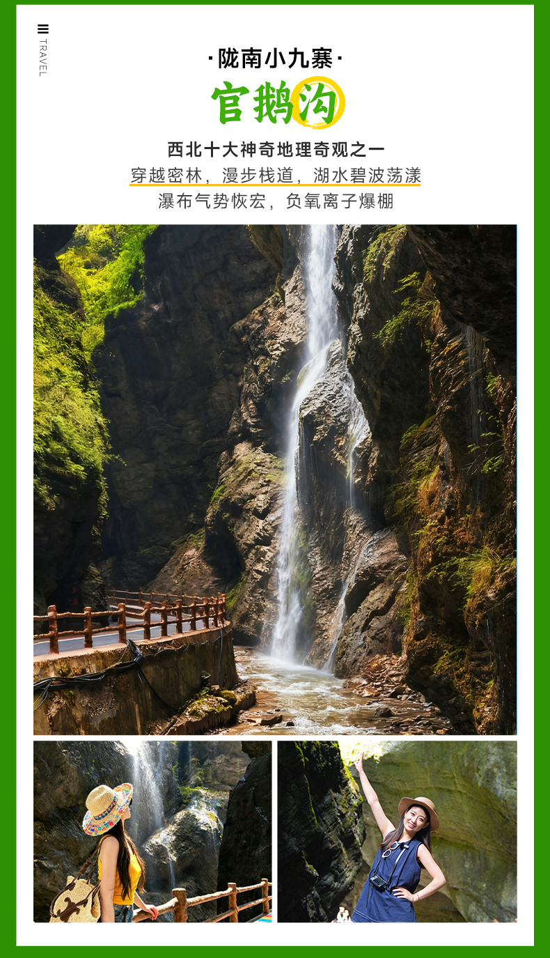 早餐后,来到中国超具潜力的小众美景【官鹅沟】(车程5KM,约15分钟,游玩3-4小时)。官鹅沟是西北十大神奇地理奇观之一 ,坊间一直流传“早知有陇南,何必下江南”的赞誉。景区内有湖泊、瀑布、原始森林、还有独具特色的羌藏村寨。相比于人满为患的九寨,这里更多了一份不被打扰的原始美。