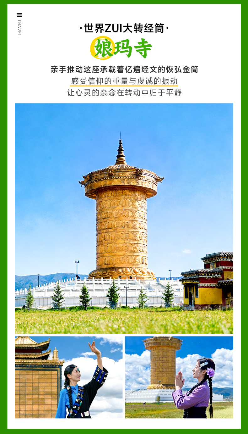 寺院规模宏大,这里有恢宏的寺院建筑群,供奉着无数的巨大佛像和各种精美的雕塑、壁画、法器等。拉卜楞寺超长的转经长廊是全世界罕见的,共2000余个转经筒,转遍每个转经筒至少需一个小时。一般游览拉卜楞寺的方式都是顺时针绕寺一圈,这也是藏传佛教的朝圣仪式。在拉卜楞寺西南角有座古老的木桥,横跨夏河,过桥上山,站在晒佛台上能将拉卜楞寺的全景尽收眼底。带给他的信徒以平安与圆满。感兴趣的小伙伴可以沿着转经长廊推转经筒,感受藏民文化。