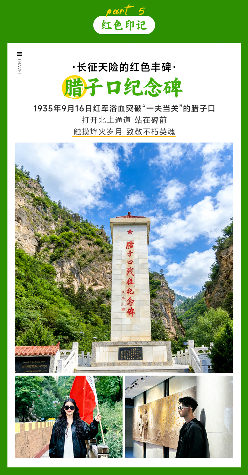 官鹅沟游玩结束后,前往【腊子口纪念碑】(车程约70KM,约1.5小时,参观1小时)。这里是为纪念1935年红军长征途中攻克腊子口天险的光辉战史而建立的红色旅游地标。也是川西北进入甘肃的重要隘口,两侧悬崖峭壁,中间只有一条狭窄的石木栈道,素有“一夫当关,万夫莫开”之称。纪念碑周边青山环绕,庄严肃穆,碑身镌刻着相关历史铭文,纪念馆陈列着红军用过的武器、衣物等实物展品,我们一起在这里重温红色历史。