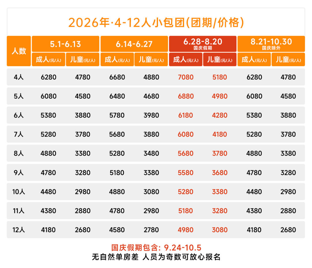 以上团期:成人4980元/人,儿童3080元/人,房差:1300元