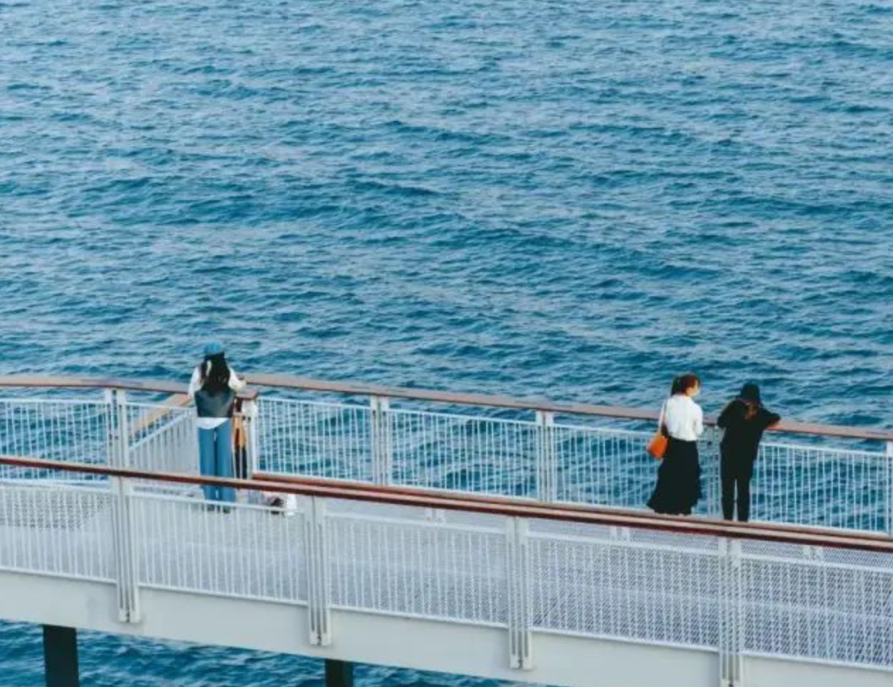 走在栈桥上,一望无际的海面波澜壮阔。栈道弯弯曲曲,蓝天白云,海蓝浪花,构成一幅美丽的景色。栈道漫步、骑行,面向大海,听惊涛拍岸,栈道旁边绿树成荫,海风拂面。