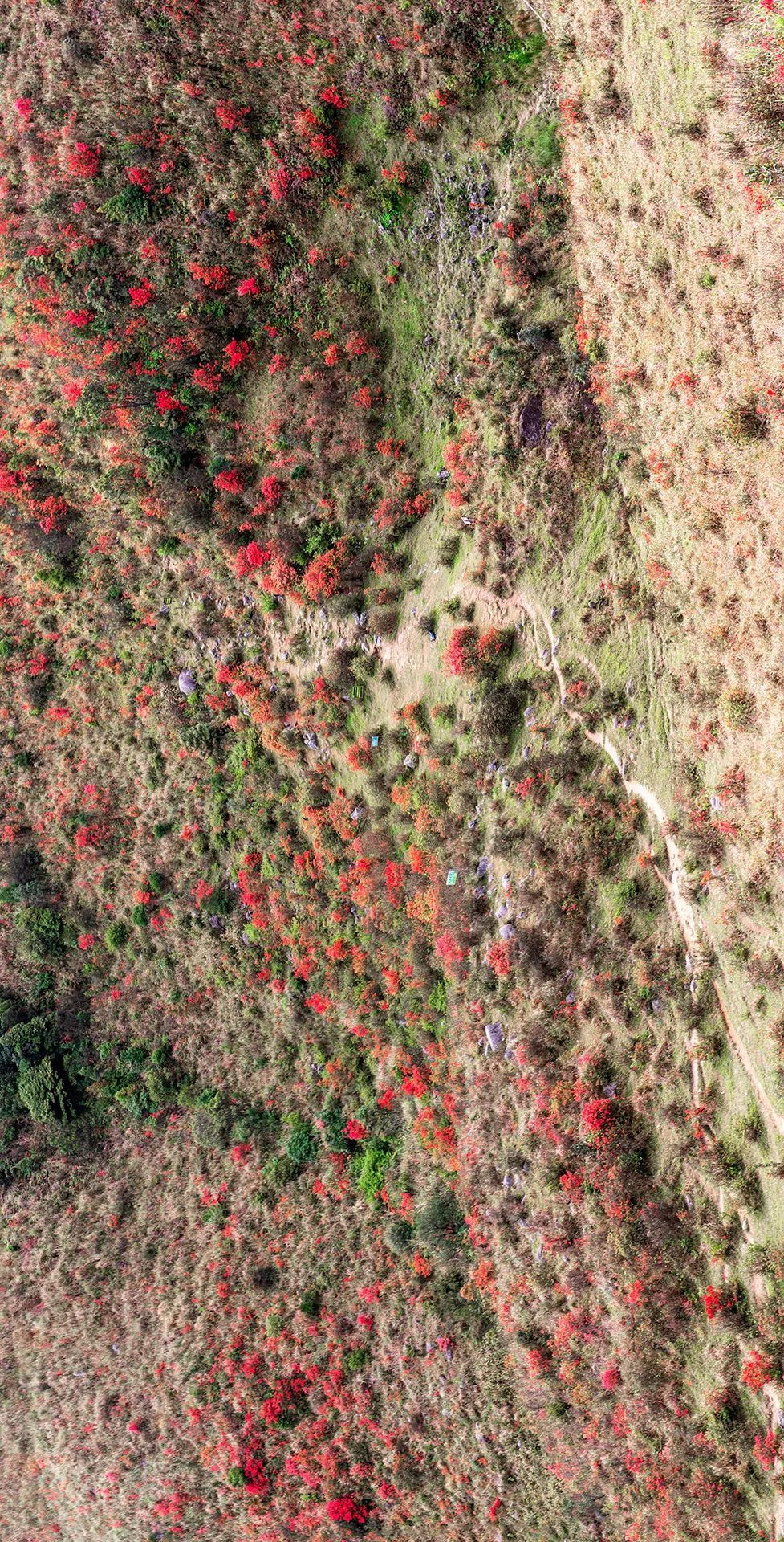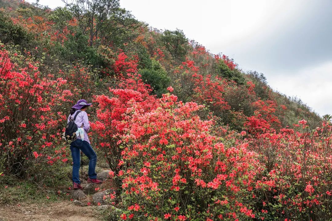 ❤ 杜鹃花被四周的群山所环抱,花朵和树木互相映衬,形成一片广阔的森林花海景观。