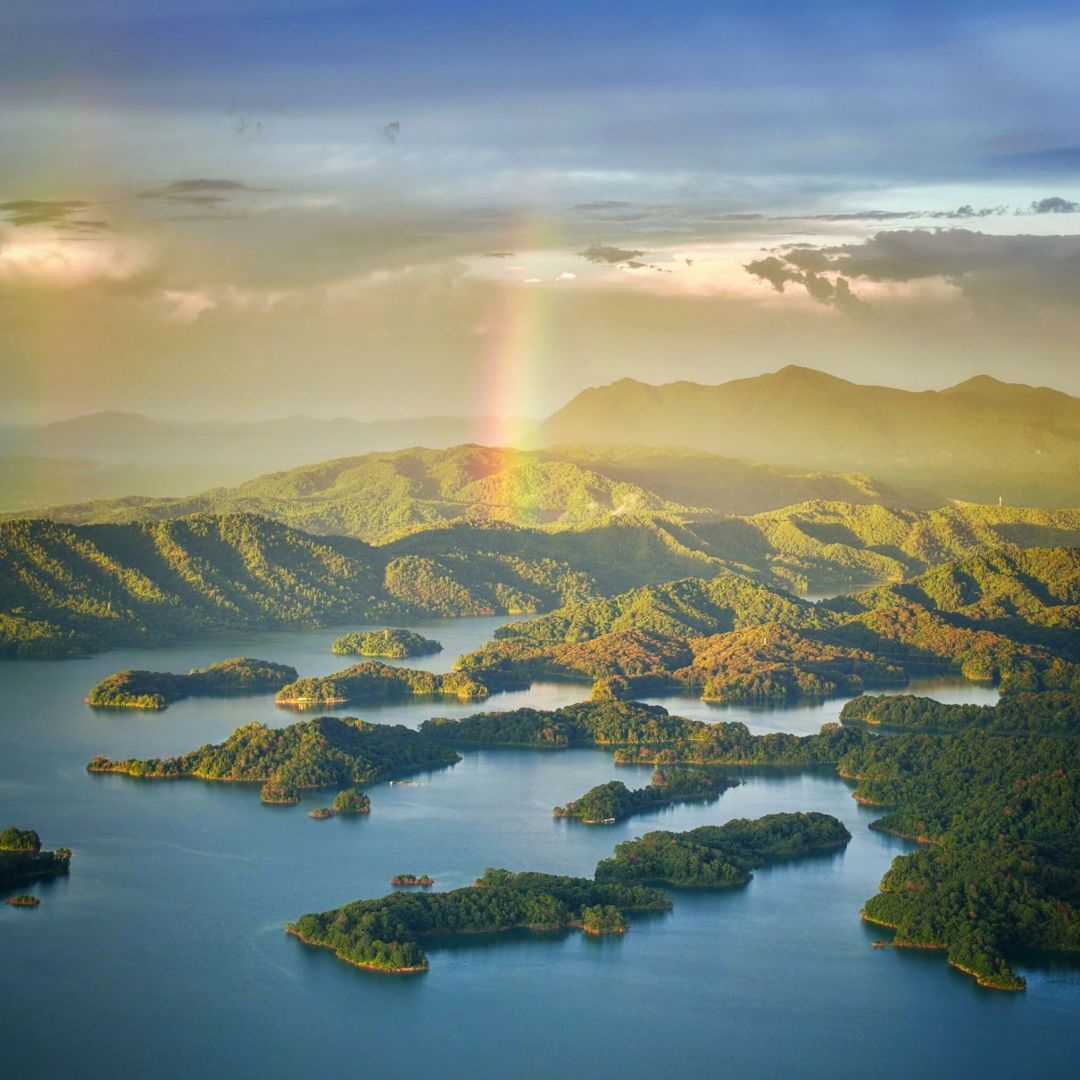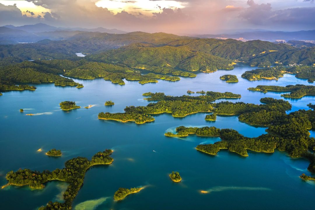三百八十多个岛屿如翡翠散落湖中,近处的苍翠欲滴,渐远的化作青黛色剪影,最远的只剩水墨般的淡痕。游船划开金色水路,岛与岛之间形成光的回廊。