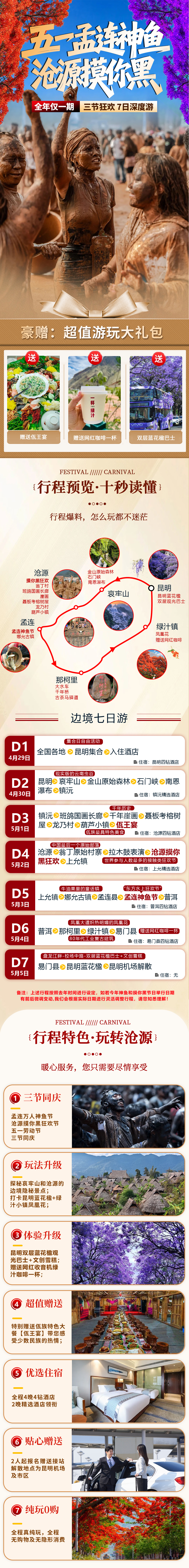 7.特别赠送:1)佤族特色佤王宴;2)绿汁镇网红录音机馆咖啡一杯;3)每人一张昆明网红双层蓝花楹环线观光巴士票 ;4)每人每天一瓶水、户外头巾及旅行三宝(赠送项目不退不换)