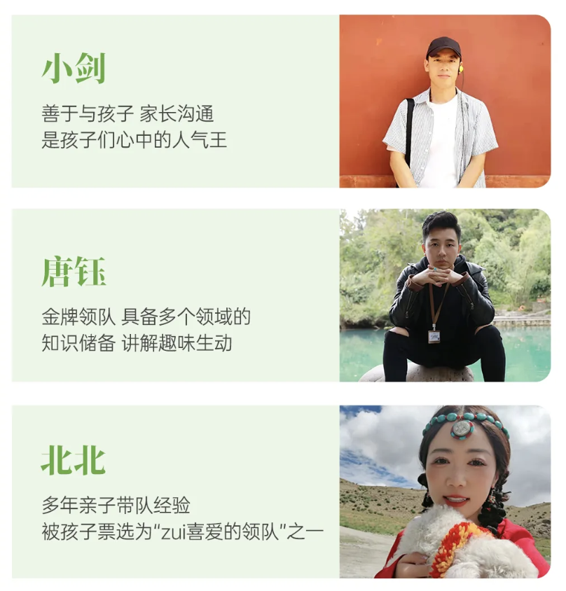 不是传统导游与向导,而是与经过系统培训的金牌领队前行,他们是孩子们的守护侠,是帮助父母甩娃的协作官。用游戏点燃孩子对世界的好奇心,在活动中开启亲子的温馨互动,让这次旅行成为美好的亲子回忆。