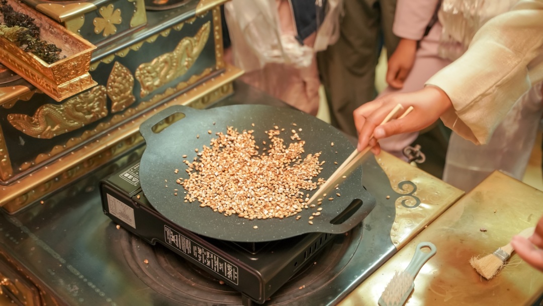 品尝牦牛奶茶、炒青稞