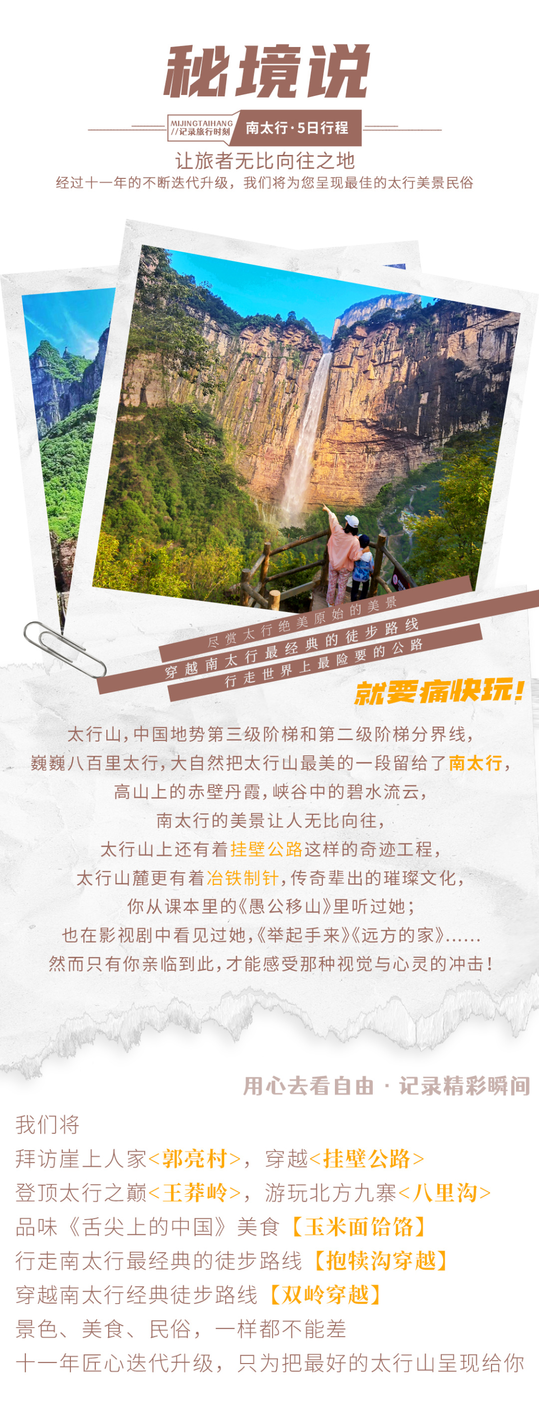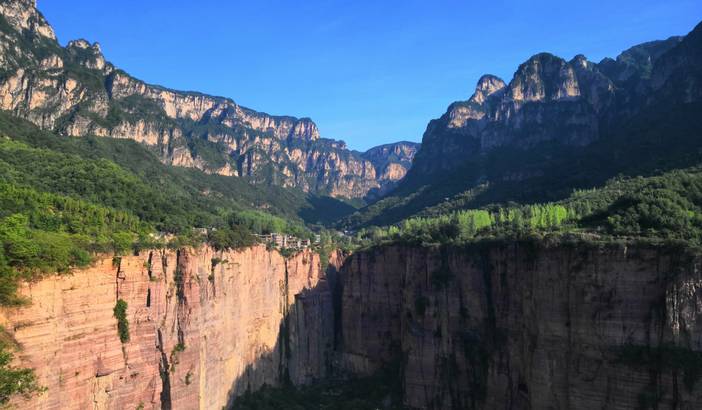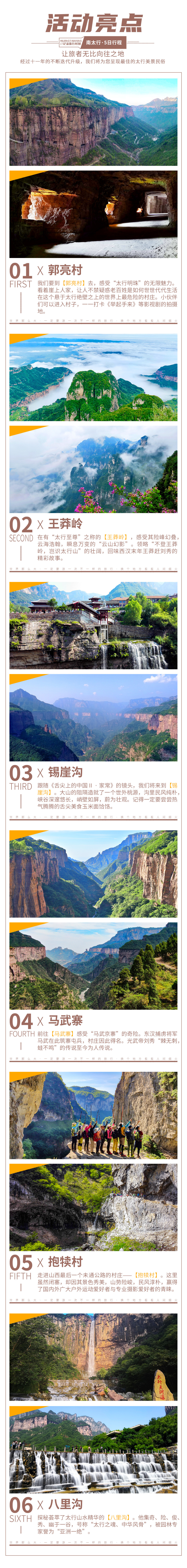 早餐后,出发前往【万仙山景区】。我们将徒步行走这世界第九大奇迹——【郭亮挂壁公路】,亲身感受十三位壮士锲而不舍的精神。站在【崖上人家】观景台上,200余米高的赤红色太行绝壁在你的面前,在你的心里横冲直撞。挂壁公路横挂其上,如梦如幻。来到【炮楼】,远处轿顶山如天宫一般,镶嵌在数百米的绝壁之上,何其壮观。在【天梯】,我们还能看到老一辈郭亮人对外沟通的唯一道路挂在崖壁之上。