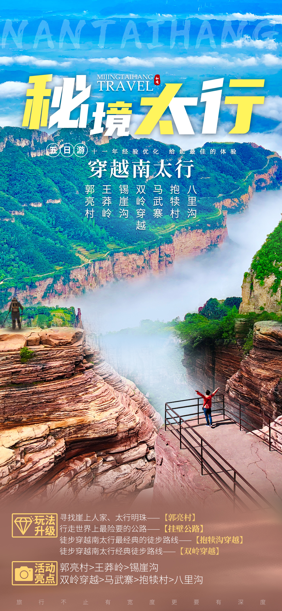 今天可以早早起床,感受一下清晨的【八里沟景区】“太行之魂、中华风骨”的魅力。也可以睡个懒觉,早餐后,大家顺沟而出。一路上,登红岩绝壁,赏峡谷云海,望流泉飞瀑,闻老子布道,更有“仙人迎客峰”欢迎您的到来!山青水秀、碧水丹崖,不愧是号称“北方小九寨”!