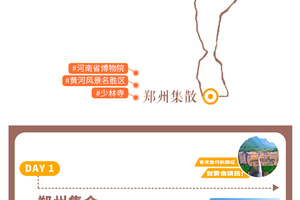 全国各地的小伙伴们到达郑州集合。到的早的亲们可以到【河南省博物院】去看看人类文明的起源发展,也可以到【黄河风景名胜区】去,感受母亲河的大河文化,还可以到【少林寺】去,学习一招半式的少林功夫……一定记要品尝河南特色美食哦,河南烩面、道口烧鸡、胡辣汤……