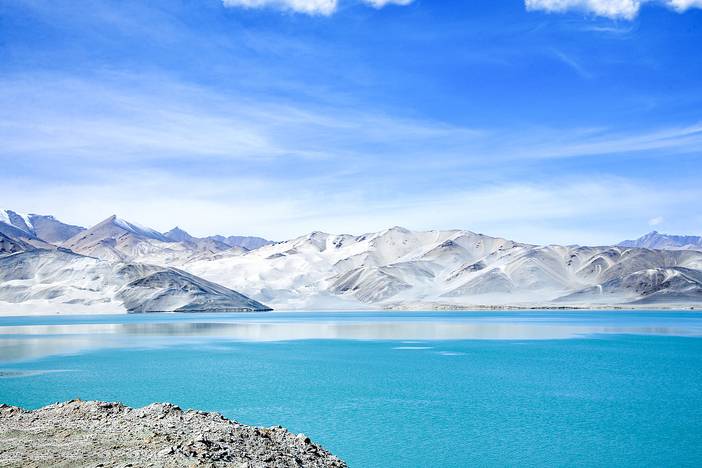 午餐后前往办理边防证,之后我们向“世界屋脊”【帕米尔高原】出发,帕米尔高原是塔吉克语“世界屋脊”,古称不周山、葱岭,古丝绸之路经过此处。沿世界上最高最美的国际公路---喀喇昆仑公路一路上升,这条公路从喀什市一直通到巴基斯坦的首都伊斯兰堡,在鬼斧神工的【白沙湖】留影,白沙湖中拥有碧蓝的湖水,远处是散落一地洁白色的沙子,而在湖泊的四周远处则是皑皑雪山。整个白沙湖都被四周的雪山团团包围住,四周高大的雪山犹如像一位慈祥的“母亲”一样守护着这片高原湖泊,让它不被外界打扰。