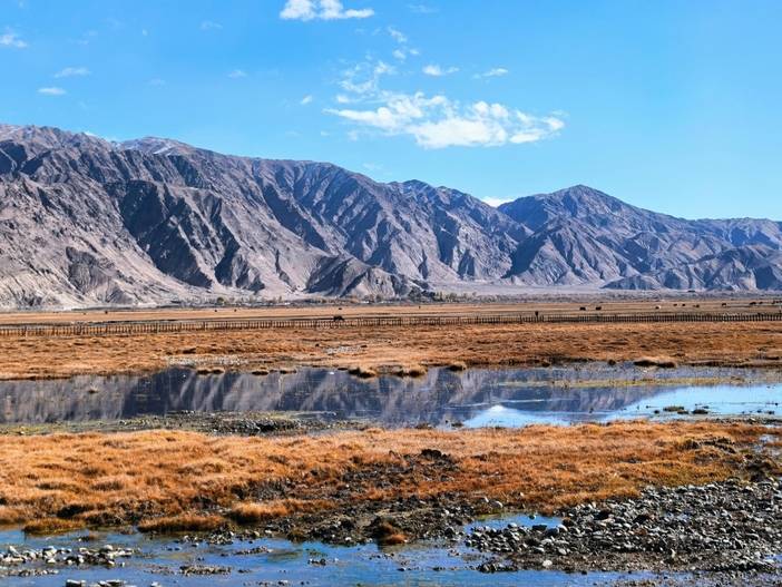 早上起床后,我们一起去到石头城和金草滩,石头城下就是金草滩,这里是难得的高原湿地地貌,塔什库尔干河流经此处形成肥沃河谷,水草丰美,牛羊遍地,日出日落之时,碧绿的草滩一片金色,漂亮而壮观。