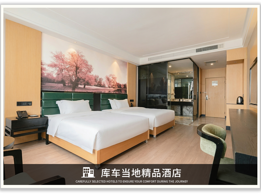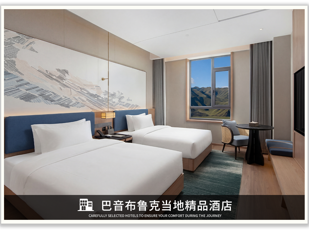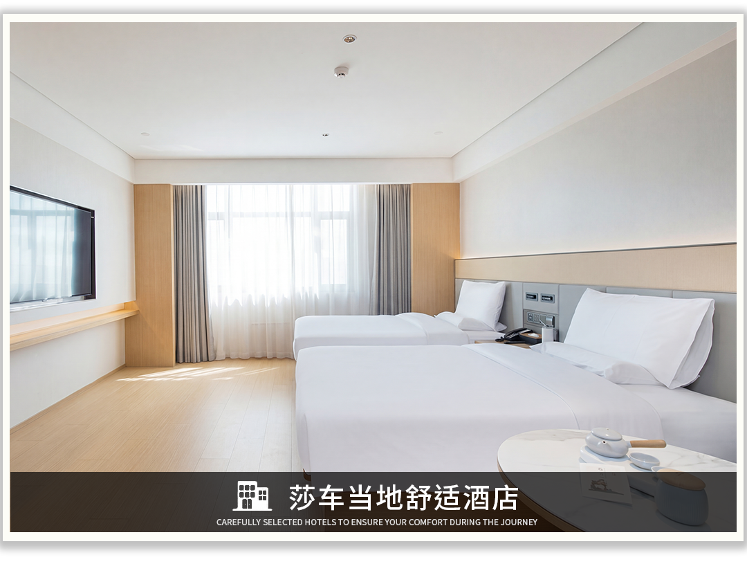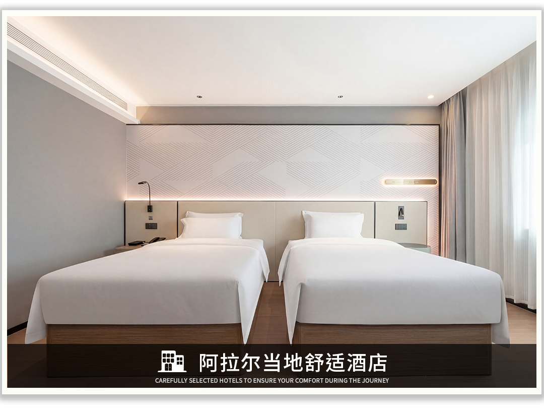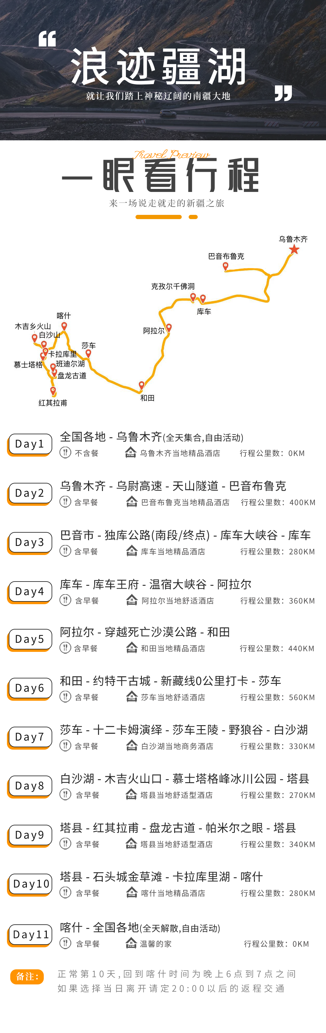 1.全程10晚住宿:乌鲁木齐当地精品酒店一晚,巴音布鲁克当地精品酒店一晚,库车当地精品酒店一晚,阿拉尔当地舒适型酒店一晚,和田当地精品酒店一晚,莎车当地舒适型酒店一晚,白沙湖当地商务酒店一晚,塔县当地舒适型酒店两晚,喀什当地精品酒店一晚
