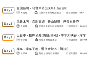 【集合地点】乌鲁木齐市区指定酒店,请报“绝色新疆”+姓名入住,酒店入住时间14:00后,提前抵达可将行李先寄存在酒店前台先出去游玩,贵重物品请随身携带,自由活动期间注意安全;