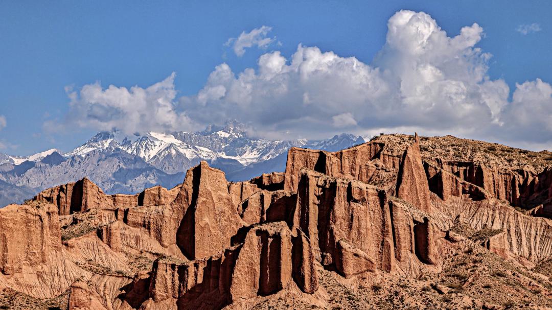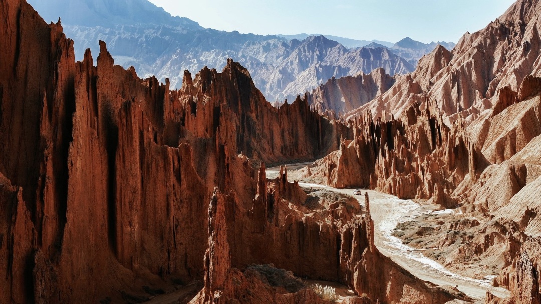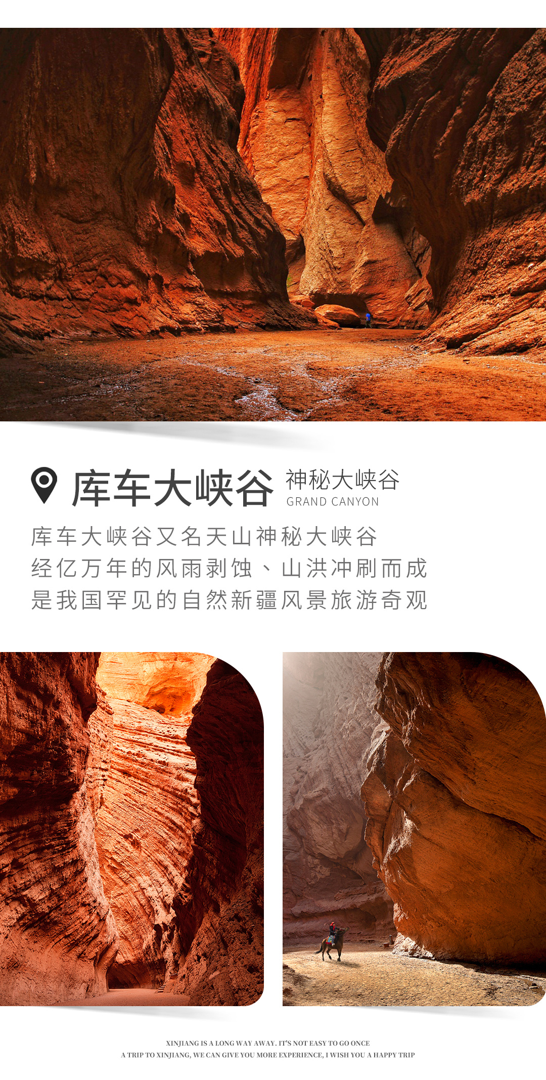 继续向南下行,地貌逐渐从草原过渡为红色雅丹,抵达库车大峡谷(天山神秘大峡谷)。峡谷内红岩嶙峋,光影变幻,尤其下午3点后阳光斜射时最为震撼。