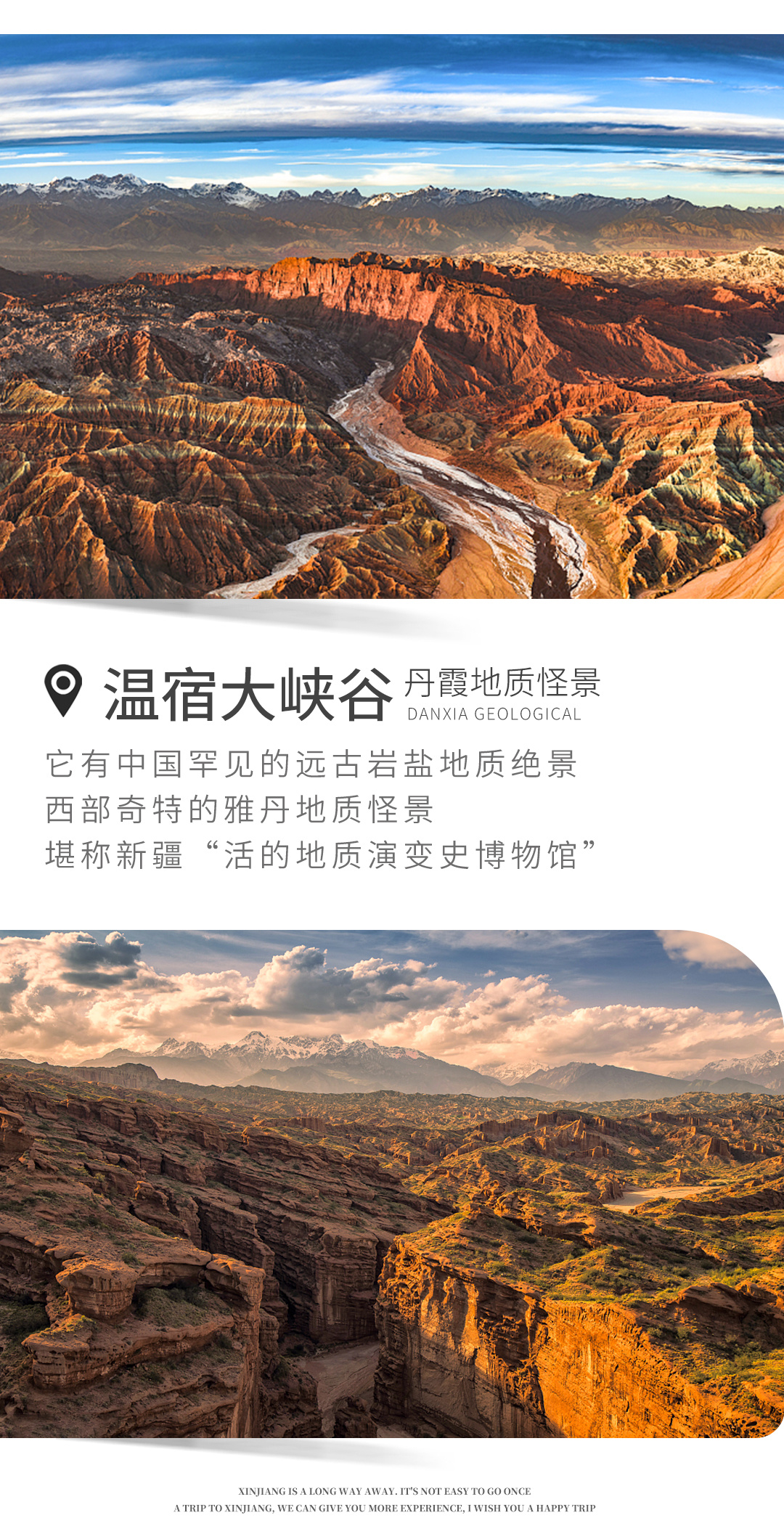 随后抵达温宿大峡谷,温宿大峡谷位于天山南麓,是新疆最壮观的丹霞地貌群之一,被称为“活的地质教科书”。亿万年的风与沙,在这里雕刻出一座赤色的宫殿。当夕阳西下,岩壁如燃烧的火焰,黄金圣殿的岩柱披上霞光,仿佛众神遗落的宝座。赤壁长廊下,每一步都像踩在时间的褶皱里,硅化木化石沉默地讲述着远古的故事。这里是摄影师的梦境,探险者的乐园,更是大自然最壮丽的诗篇。