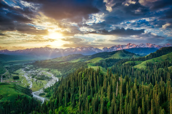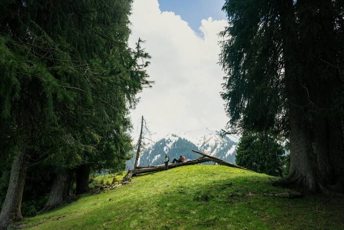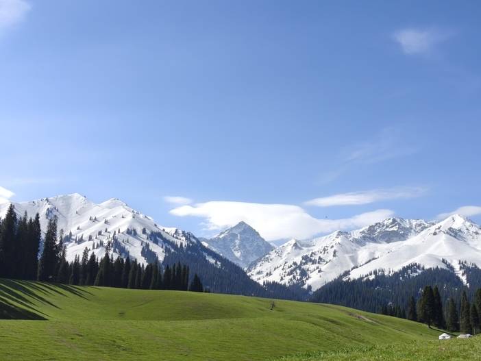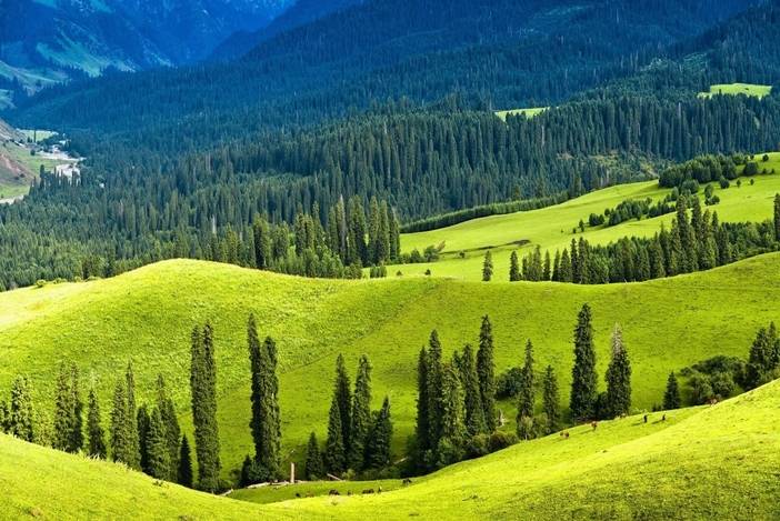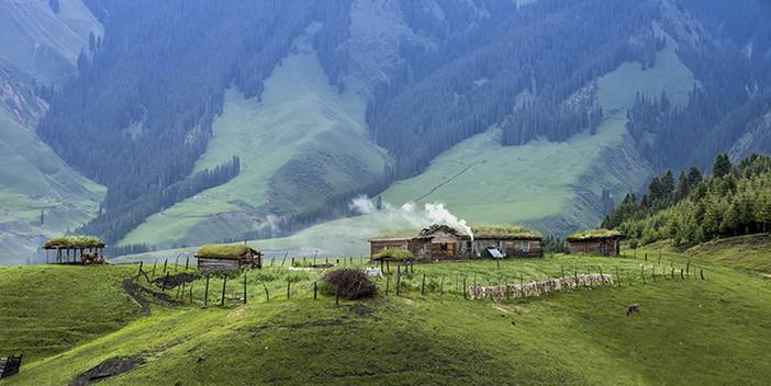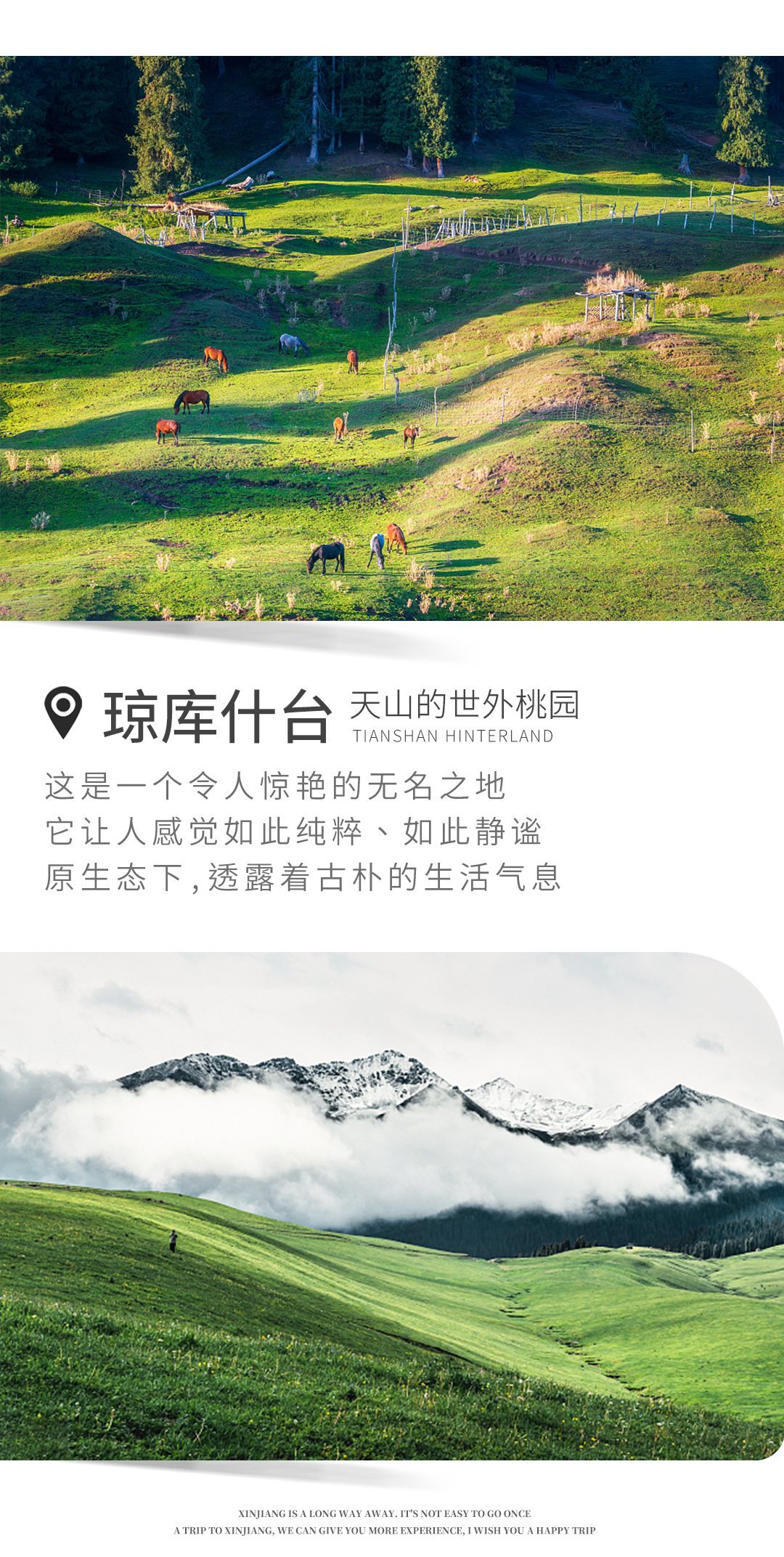 今早可以适当睡个懒觉,吃完早餐后乘车前往琼库什台,进入琼库什台的路上,其实就是在人体草原穿行,一路盘山而行,沿路可以看到草原,雪山,松林。村内居民以哈萨克族为主。村庄四面环山,房屋依水而建。