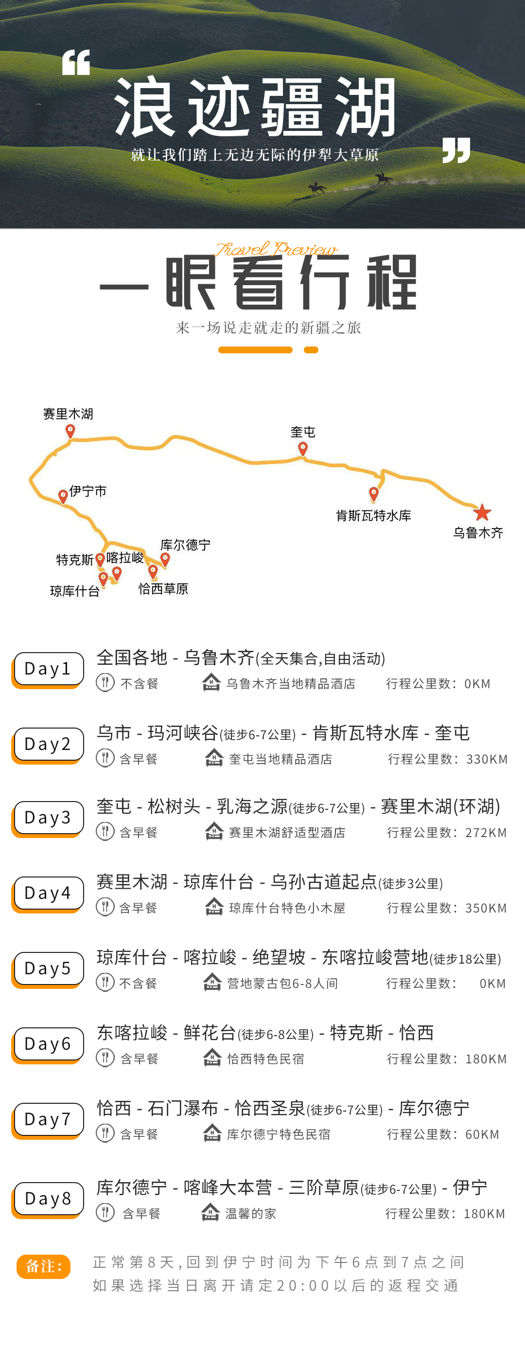 温馨提示:解散时,先送达伊宁机场,飞机离开的驴友请预定18点以后得航班。后抵达火车站,火车离开的驴友请预定17点以后得火车班次。如需留在伊宁继续游玩的驴友需要住房可以提前联系客服代订。