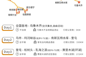 【集合地点】乌鲁木齐市区指定酒店,请报“绝色新疆”+姓名入住,酒店入住时间14:00后,提前抵达可将行李先寄存在酒店前台先出去游玩,贵重物品请随身携带,自由活动期间注意安全;