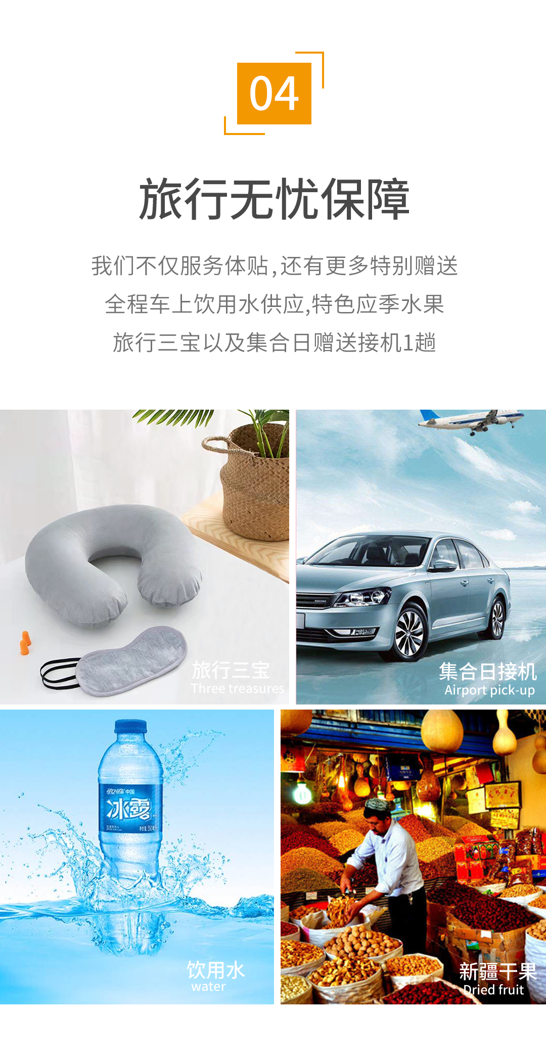 2、全程赠送随车饮用水及特色应季水果(或者新疆干果);