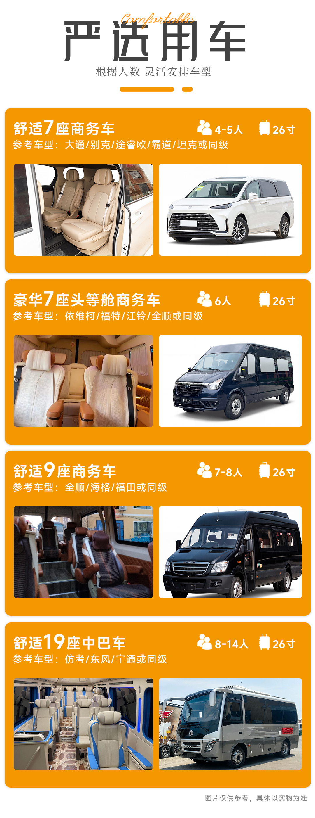 7-8人以下为豪华9座商务车(海格/福田/江铃/全顺或同级别)
